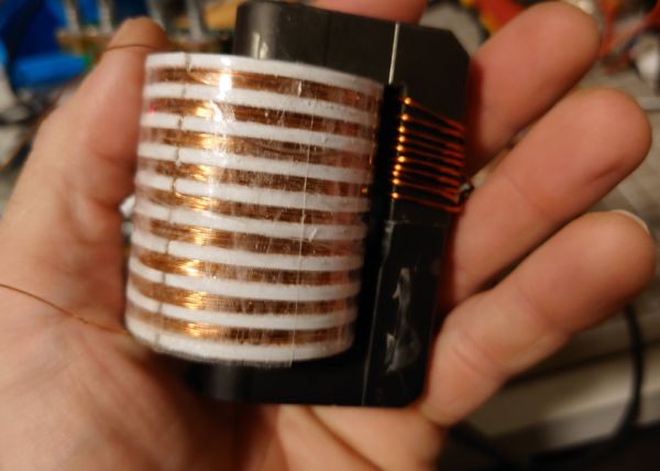 Aber kommen wir mal zum praktischen Teil. Das erste quick&dirty Experiment hatte ich schnell zusammengewürfelt aus Zeug das der allgemeine Technikfreund eben so daheim herumliegen hat, bestehend aus Labornetzteil, einer schnell zusammen gelöteten Lochrasterplatine, bestückt mit NE555ern (Timer-IC) und Mosfettreiber, den dicksten Transistor den ich gefunden habe, glaub es war ein irfp460 n-Channel Mosfet oder gleichwertig, ein Ferritkern, eine runde Spule, dessen Körper ich schnell gedruckt hatte und fertig. Das hat dann ausgesehen wie folgt: