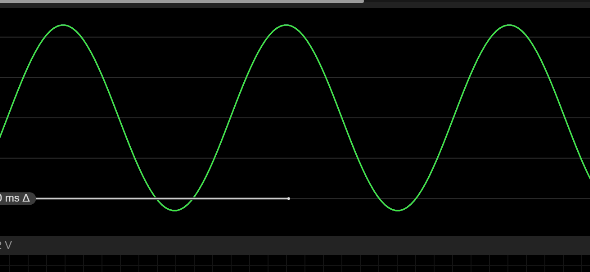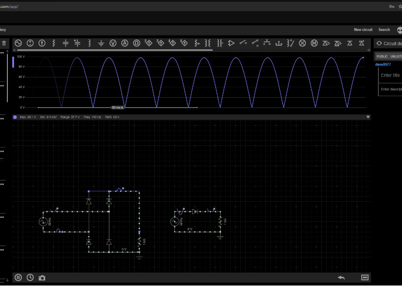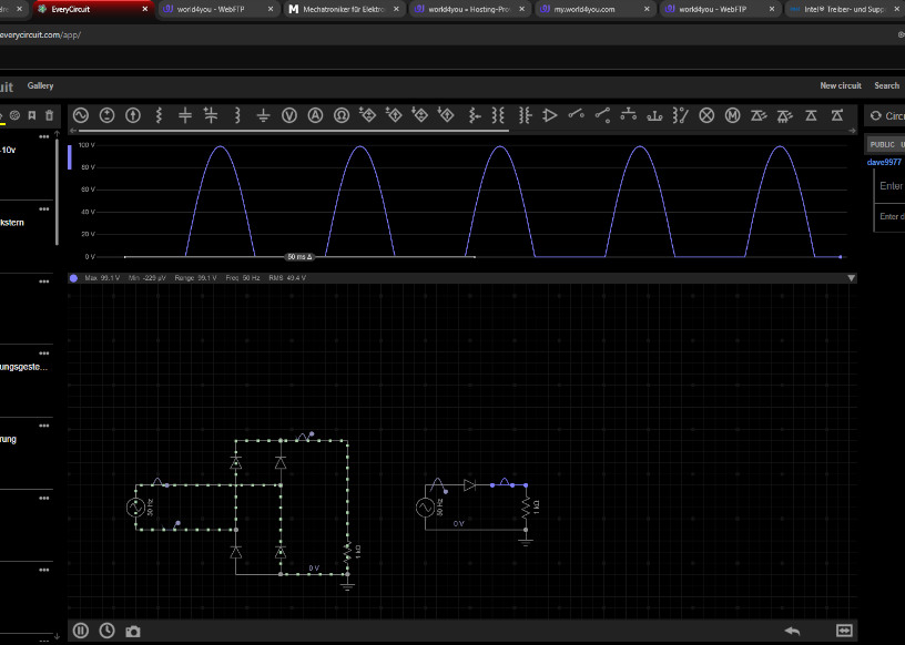 Im nächsten Bild ist die kleinere Schaltung in der Mitte aktiv, sie zeigt eine Einweggleichrichtung, ebenso wie das blaue Signal. Am Spannungsverlauf sieht man schön, dass richtige Lücken entstehen, weil einfach nur die untere Halbwelle wegradiert ist. Diese Lücken sind übrigens in Europa, genau 10 Millisekunden lang. Weil 50 Herz umgerechnet ergibt eine Sinuskurve (also einmal untere und einmal obere Halbwelle) genau 20 Millisekunden. In unseren Steckdosen wechselt also die Polarität der Spannung 50 mal in der Sekunde oder eben alle 10 Millisekunden.