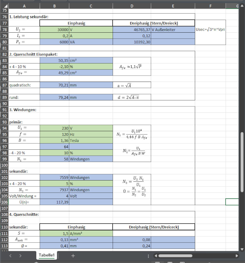 Will man einen Trafo berechnen, sollte man zunächst bestimmen welches Eisenpaket nötig ist. Das kann man einfach mithilfe von entsprechenden Tabellen und der benötigten Leistung ermitteln. Ich habe glücklicher Weise in Deutschland eine Firma gefunden die auch kleine Mengen gestanzten Trafobleches verkauft. Das Ziel ist zwar natürlich ein drei phasiger Trafo, aber dem wollte ich mich stufenweise nähern. Ich habe mich für ein UI210 Blech und für später mit mehr Mut 3UI210 entschieden. UI deswegen weil wenn man sich ein U vorstellt und ein I als Deckel oben drauf legt - bekommt man quasi eine eckige 0 - so würde ich für erste Versuche die primäre und die sekundäre Wicklung jeweils auf einen eigenen Schenkel stecken können. Das war mir in so fern wichtig weil die nächsten Tests mit Netzspannung statt finden würden. Aber zurück zu den Basics, als Elektrologe wusste ich natürlich das sich das "Übersetzungsverhältnis" eines Trafos aus dem Verhältnis zwischen primär Windungen zu sekundär Windungen ergibt - das war es dann aber auch schon. Also Google, Wikipedia und Amazon befragt und als nächstes die gelernten Formeln in ein Excelsheet gepackt, ein wenig hin und her gerechnet, Ergebnisse verglichen mit Tools die es im Netz gibt, sowie zwei Handyapps und siehe da - die Ergebnisse waren immer sehr ähnlich, das hat mir gereicht.