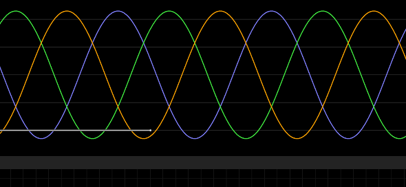 Wir sehen im markierten Bereich, dass eigentlich für die 7000VA ein 3UI180 c zulässig wäre. Nachdem wir aber lieber Reserven haben, nehmen wir gleich eine Nummer größer - Was gerade bei hohen Spannungen nicht schlecht ist weil man einfach mehr Platz braucht als für weniger Spannung. a, b und c stehen in dem Fall für die Paketdicke. In unserem a-Fall (3ui210 a) sind das 70mm, da die Bleche ansonsten auch 70mm breit sind - werden die Schenkel im Querschnitt also quadratisch. Material hab ich kein spezielles genommen sondern eher ein Standard Blech mit 1,36 Tesla (diese Größe ist nach dem wahren Genie Nicola Tesla benannt und nicht etwa nach der Automarke, die seit 10 Jahren autonomes Fahren verspricht und noch immer nicht kann). Woher weiß ich jetzt ob ich ein ui, ei oder 3ui blech brauche? Auch wegen der Leistung. Liegt sie unter 3600VA reicht eine Steckdose, die mit 16A abgesichert ist - es reicht also eine Phase. Liegt es darüber, sollte es dann schon mal 3phasig sein, weil eine Phase selten stärker abgesichert ist. Aber kommt natürlich auch auf den individuellen Zweck/Ort, usw an. Ein weiterer Vorteil 3 Phasen vs eine Phase ist (sofern man am Ende Gleichstrom benötigt), das man bei drei Phasen schon mal weniger Rippel zum glätten hat. Das hängt damit zusammen das einphasiger Wechselstrom bei jedem Wechsel der Polarität den Nullpunkt durchläuft und rund um diesen Punkt wird keine Energie übertragen, was im Bezug auf das Sieben zur Folge hat, das man viel mehr Energie zwischenspeichern muss. Die drei Phasen haben eine Phasenverschiebung von 120 Grad zu einander, in diesem Abstand gibt es keine Punkte mehr wo null Energie übertragen wird. Ich werde das mal eben Illustrieren...