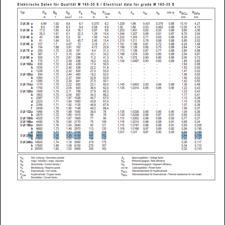 Man nimmt einfach die Zahlen, die man weiß und errechnet daraus, was man nicht weiß. Zunächst muss man wissen das es je nach Art des Trafos, verschiedene Formen des Eisenpaketes gibt, es gibt oder gab Schnittbandkerne, Ringkerne sind heute noch häufig verbaut. Am meisten verbreitet aber sind die bereits erwähnten aus Blechen gestapelten Kerne, meist in E I oder U I Form - welche es auch von winzig klein bis wirklich groß gibt. Am Anfang weiß man zumindest welche Spannung man primär hat und welche Spannung und Strom man auf der Sekundärseite herausbekommen soll. Brauche ich zB 70KV bei 100mA Sekundär, ergibt das (70000 x 0.1 = 7000) 7000VA oder 7 KVA - womit man im Prinzip schon die Menge an Energie kennt, die nun von der Einen zur anderen Seite geschaufelt werden muss. Da letzten Endes das Eisenpaket die Energie von der einen Spule auf die andere überträgt, fängt man damit an. Wir suchen uns die endsprechenden Tabellen und schlagen nach: