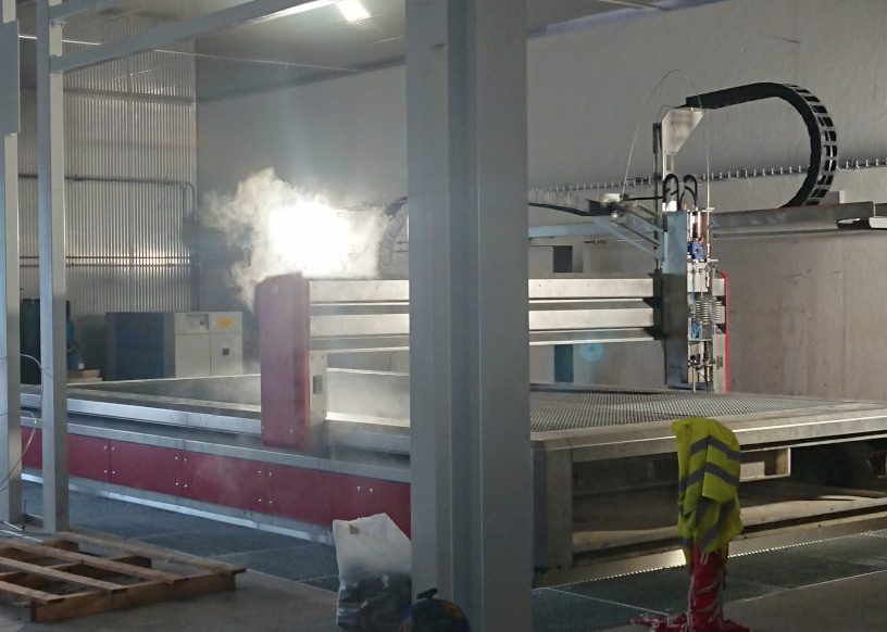 Was hier fast wie Dampf aussieht, ist Wasser das unter 3-4000 bar Druck aus der lecken Hochdruckleitung spritzt. Diese Leitungen sind aus einer speziellen Legierung und haben nur einen sehr kleinen Innendurchmesser. Trotzdem schleift das Wasser mit der Zeit ein Loch durch die Leitung. Die Hochdruckleitungen, sowie Gelenke, Verbindungselemente, Reduzierungen und auch alle Komponenten des Schneidkopfes sind typische Verschleißteile bei einem Waterjet.
