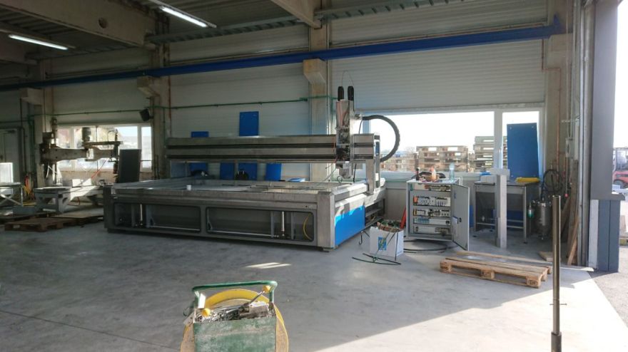Auch eine Konstruktion der KMA GmbH. Ich habe die Maschine damals aufgestellt und mittlerweile auch schon repariert und serviciert. Die Maschine verfügt über einen 3D Schneidkopf. Standard CNC-Maschinen verfügen typischer Weise über drei Achsen, X, Y und Z, welche sich auf die Hauptvektoren im kartesischen Koordinatensystem beziehen. Bei komplexeren Maschinen wie es auch hier der Fall ist, können noch A, B und C dazu kommen, welche die Rotation um die X, Y und Z Achsen beschreibt. Diese Maschine hat 5 Achsen, X, Y, Z, A und C. Während man bei 3 Achs-Maschinen quasi nur in 2d schneiden kann, sind mit einer 5 Achs-Maschine wesentlich komplexere Werkstücke in 3D möglich. So kann ein Steinmetz mit so einer Maschine zum Beispiel, jede beliebige Form in Gehrung schneiden, was gerade bei Küchen in Stein oft gefragt ist.